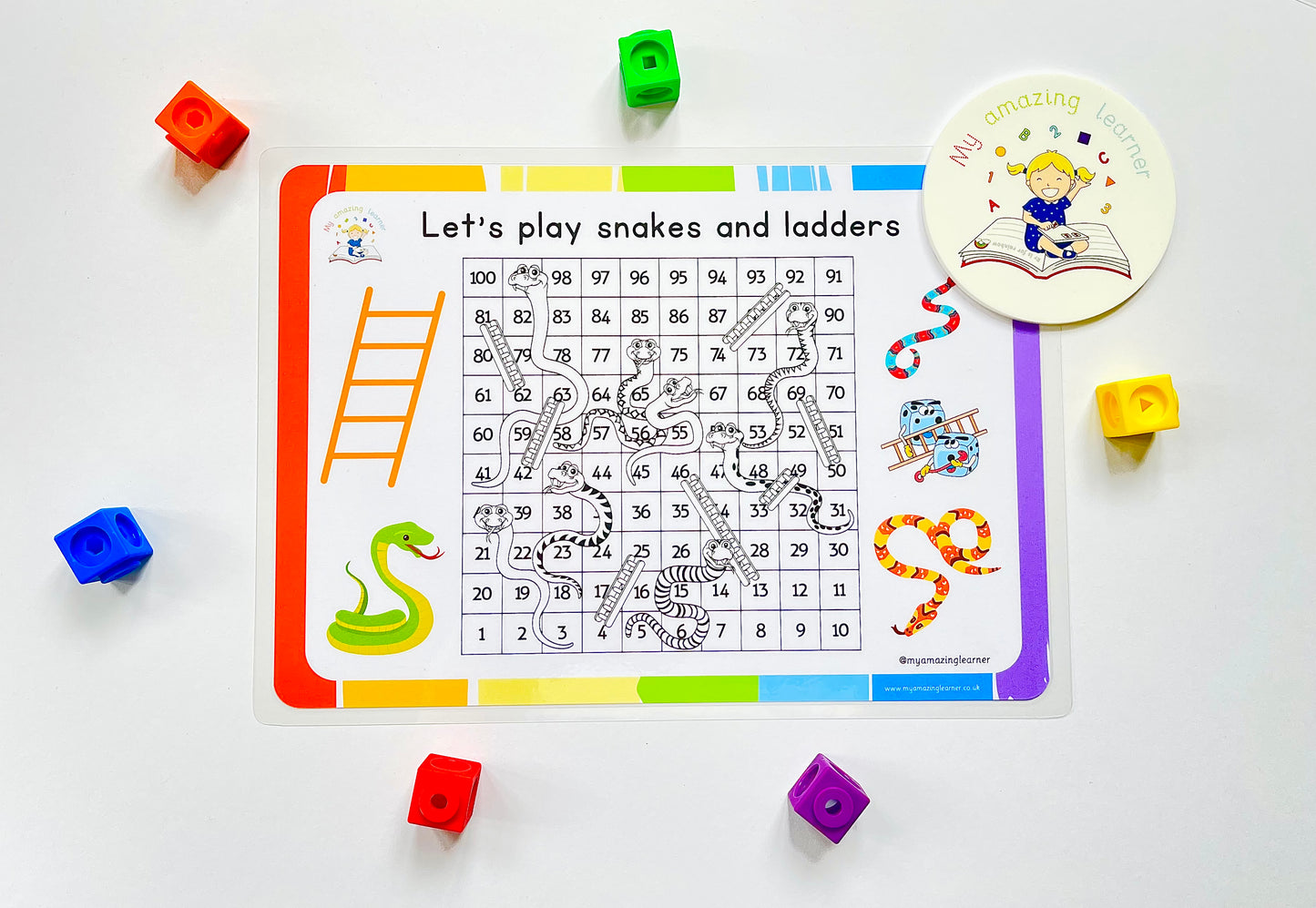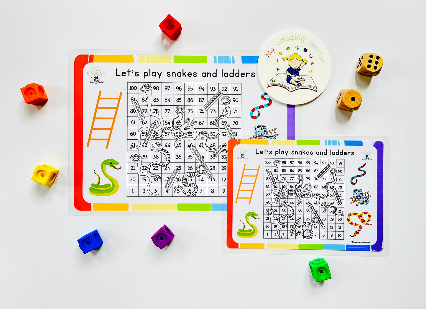 Snakes and Ladders is a classic and enjoyable activity that can also enhance mathematical skills through determining the number of spaces to move. When reaching a ladder, players must jump a certain number of spaces, but encountering a snake requires them to go back a certain number of spaces. This game incorporates addition and subtraction in a fun and engaging way. Each player can use their own colour dry erase pen and mark their progress on the laminated worksheet provided with the game. By rolling the dice, players can mark their arrival space and continue the game by simply wiping off the previous mark and adding a new one on the next space reached. The goal of the game is to be the first player to reach the 100 square.