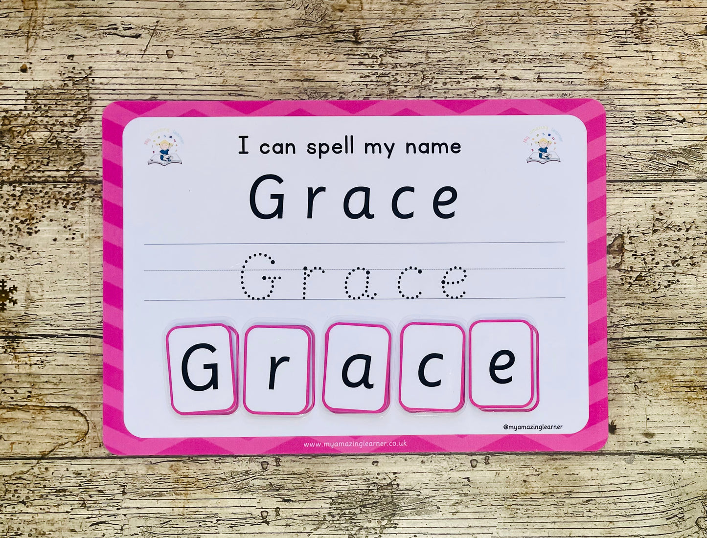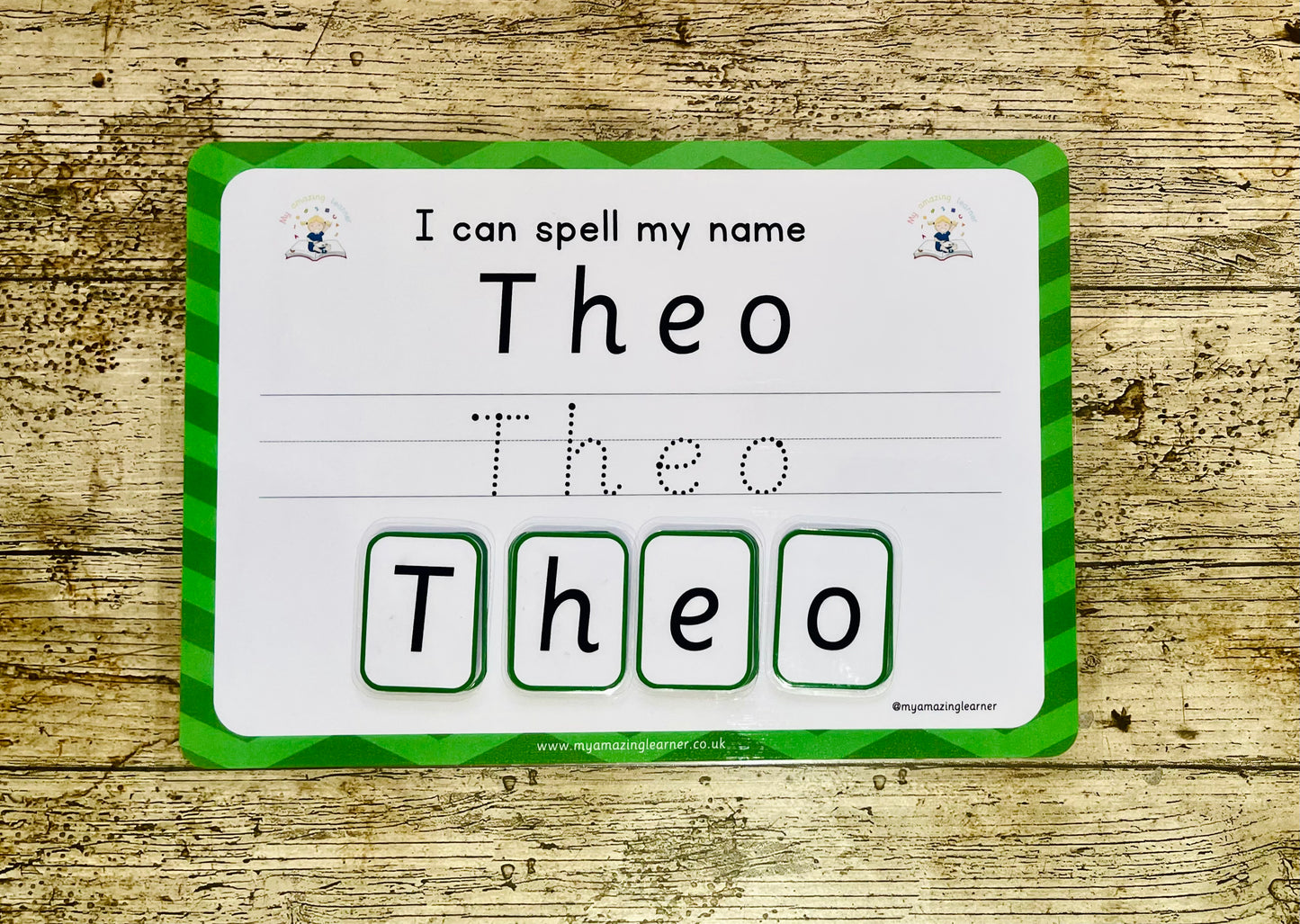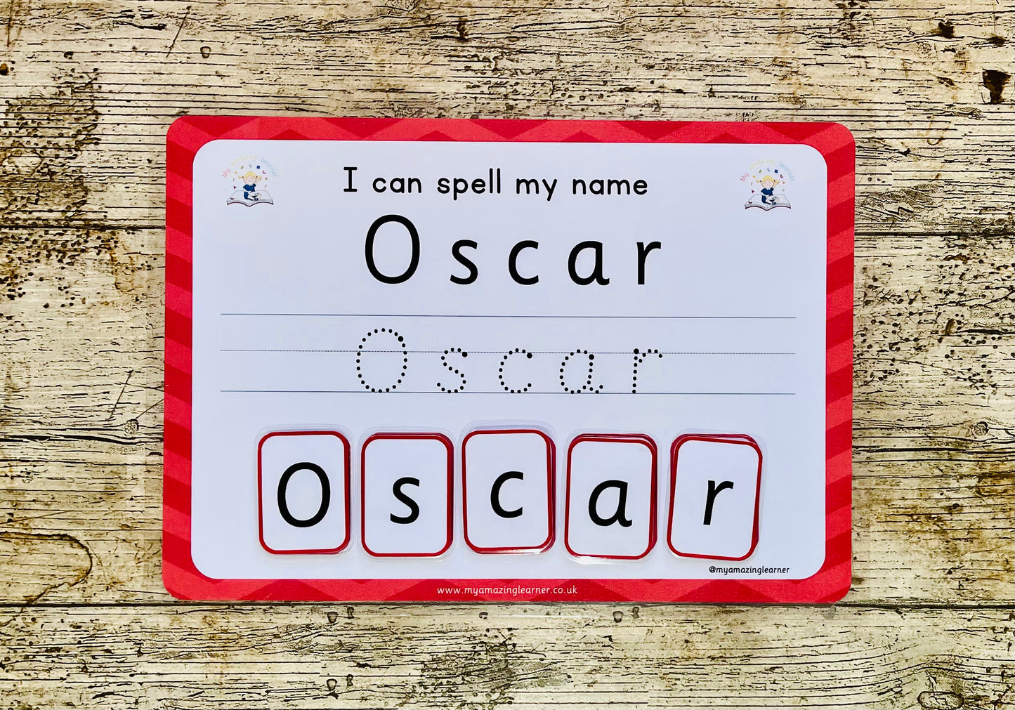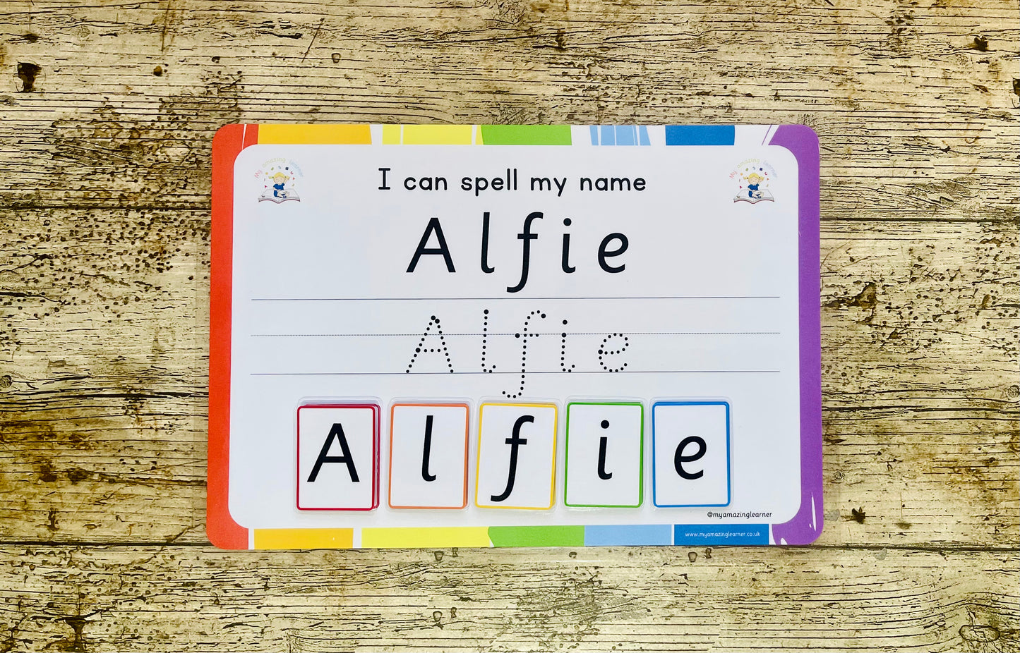 Get your 'Amazing Leaner' to learn to spell their name with our educational and interactive worksheet. Improve their pen control and letter recognition with our dotted guide and perfect their spelling skills with the velcro letters. Perfect for nurseries, preschools, and early years teachers, our bulk name sets are available with the option to add your logo.
