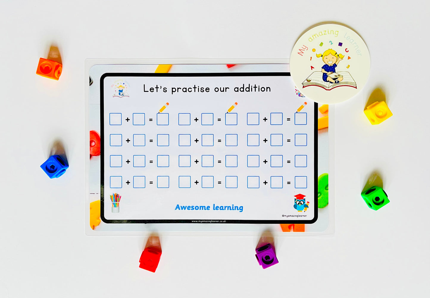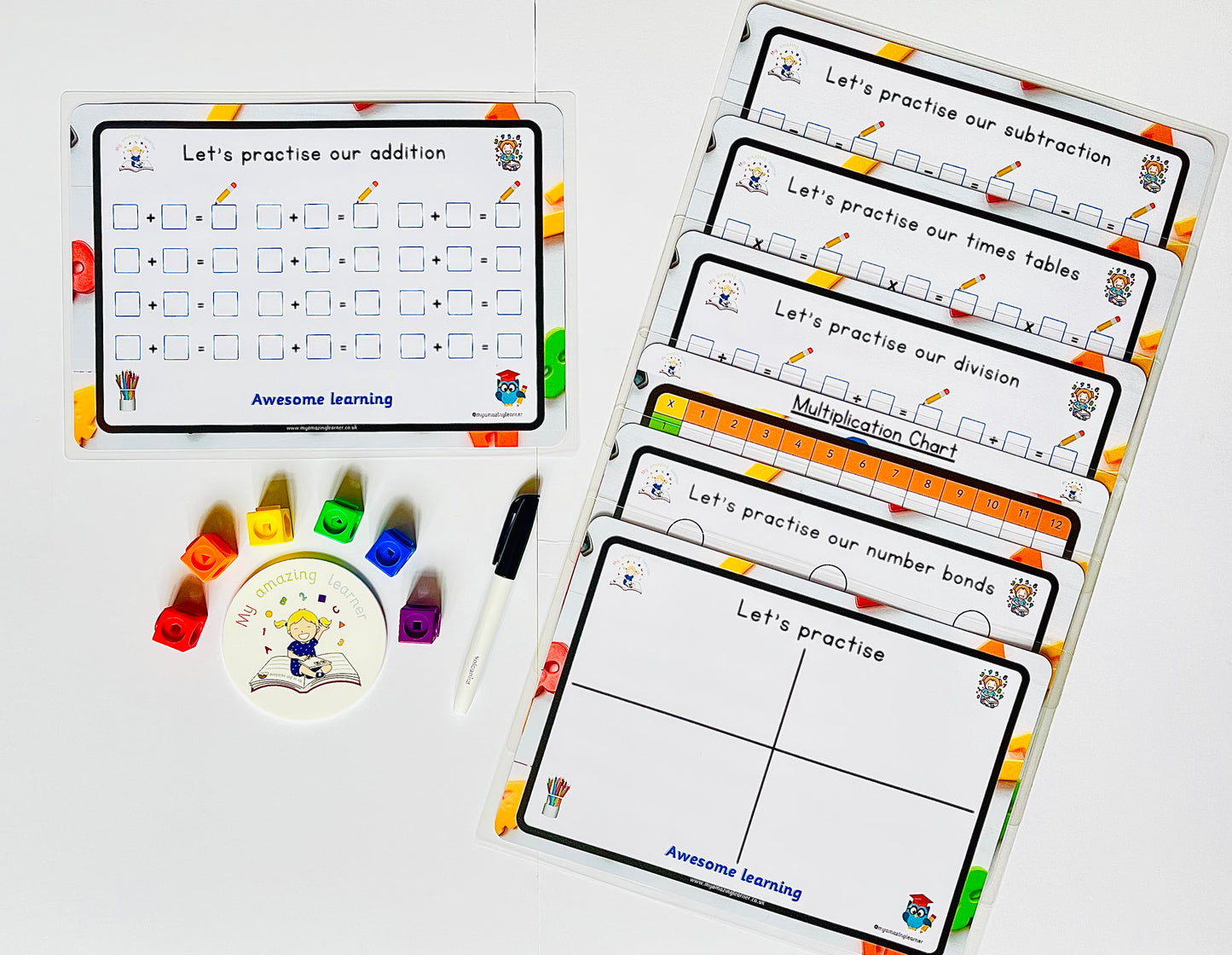 In addition to our popular learning to write starter pack, we offer a comprehensive Maths Starter Pack. This includes 7 reusable worksheets covering: * Addition * Subtraction * Multiplication * Division * Multiplication chart (1-12) * Number bonds * Blank worksheet for practice. These resources are essential in assisting and motivating your young learners to enhance their maths skills. They serve as strong building blocks for core maths concepts and provide a solid foundation for key stage 1 and key stage 2. We also have a variety of additional worksheets available to expand your personal learning pack.