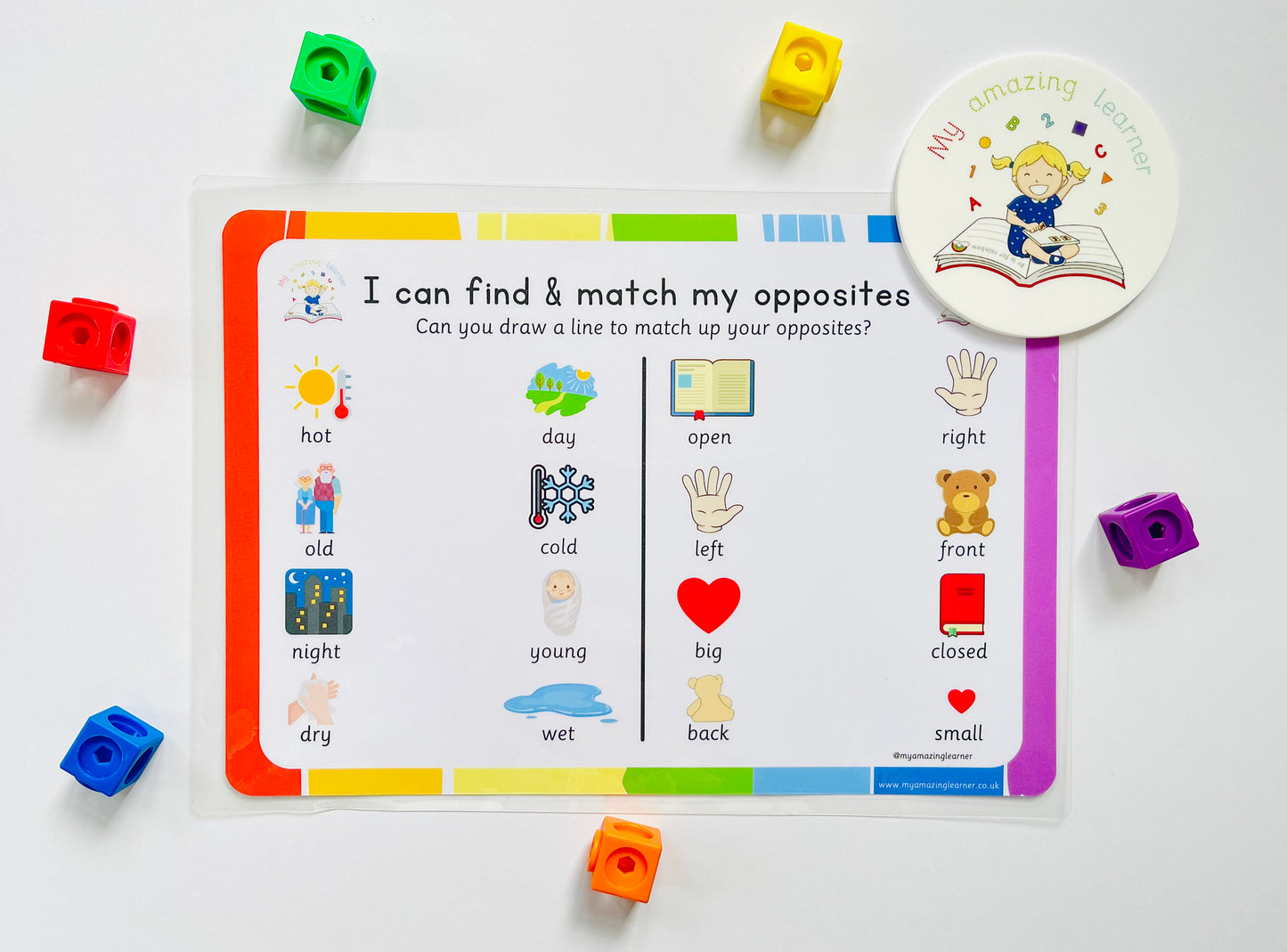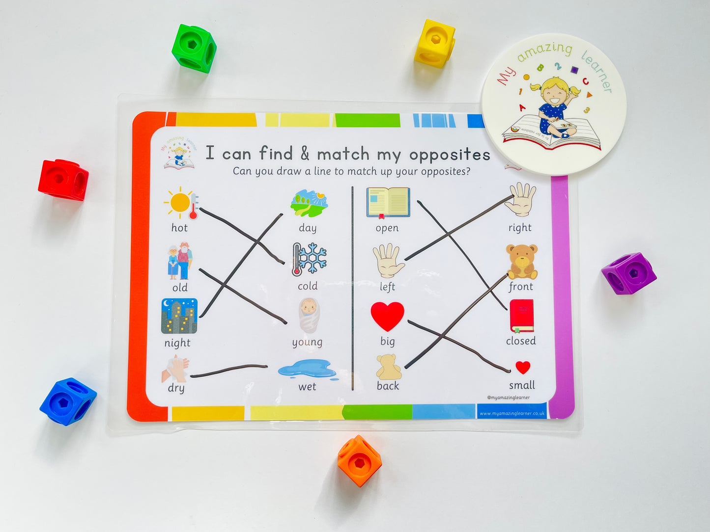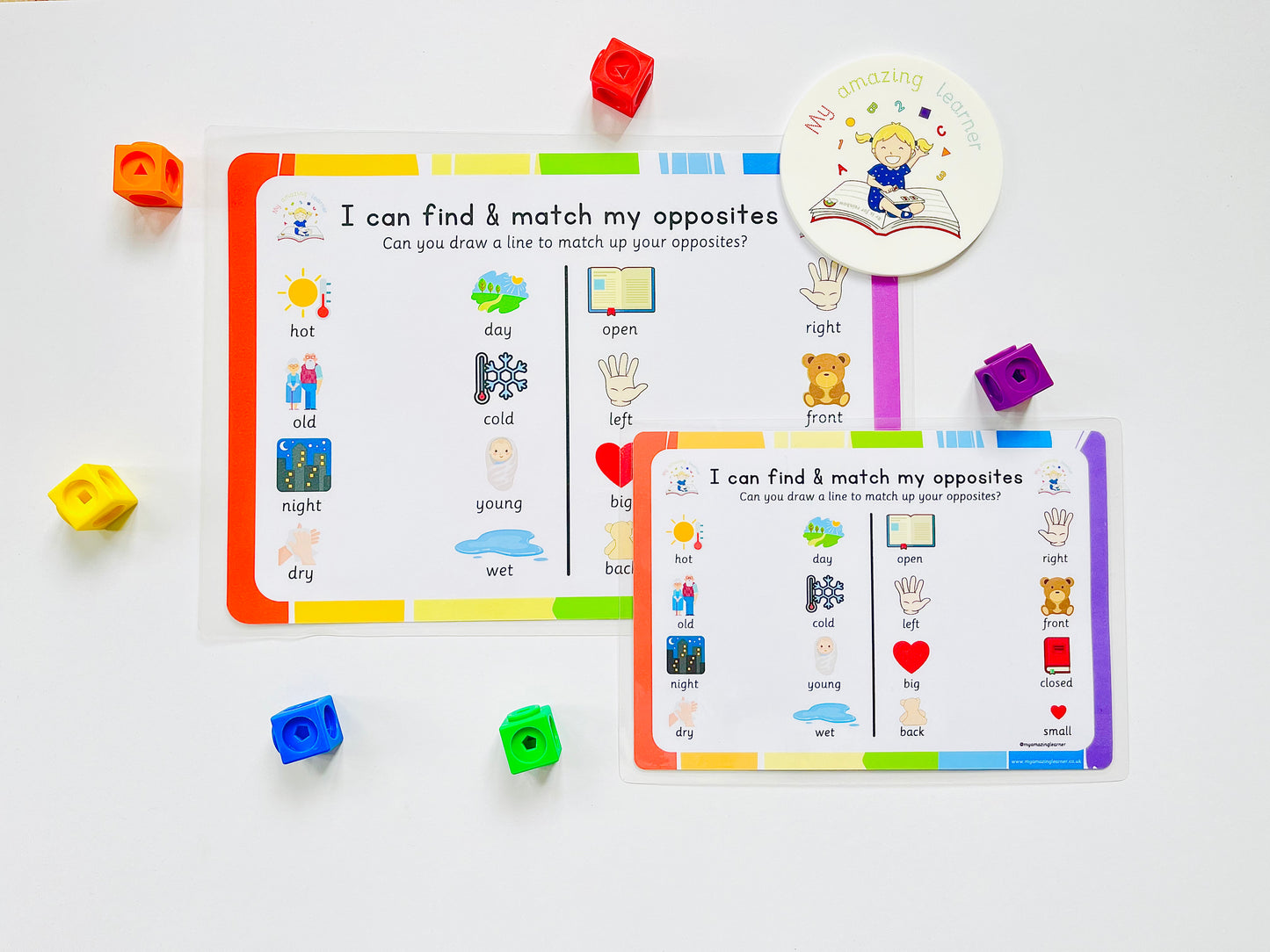 Learn all about opposites with these engaging and educational wipeable worksheets. Grab a dry erase pen and let your learners dive into the exciting activities offered. But what exactly are opposites? By introducing simple opposites and fostering recognition in a fun way, your learners can expand their knowledge in a meaningful way. Additionally, our worksheets come in both A4 and A5 options, making it convenient to use at home or on the go. By using durable 160gsm card and 250 micron laminate sheet, these worksheets are a durable and long-lasting learning resource. Check out all the different sets and worksheets we offer and create the ultimate Amazing Learner folder today!