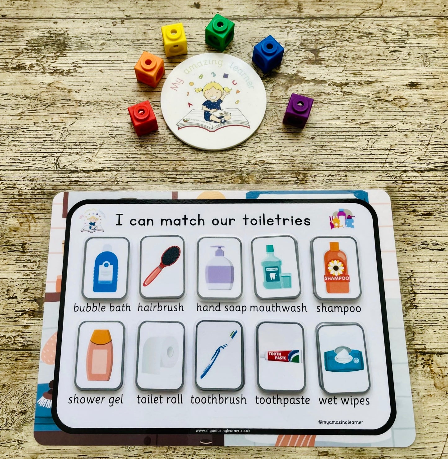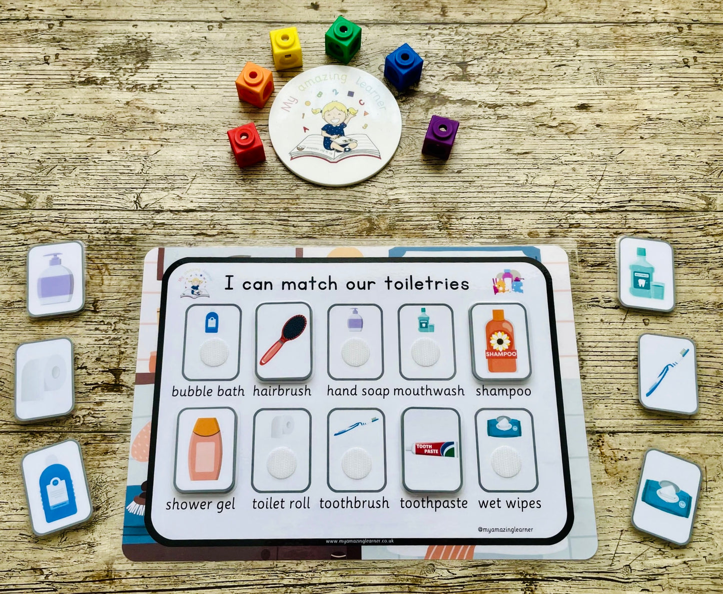 Our Toiletries velcro mat enables your 'Amazing Learner' to practise their matching and sorting skills whilst learning the about different types of toiletries. This mat is perfect if you're packing to go on holiday.