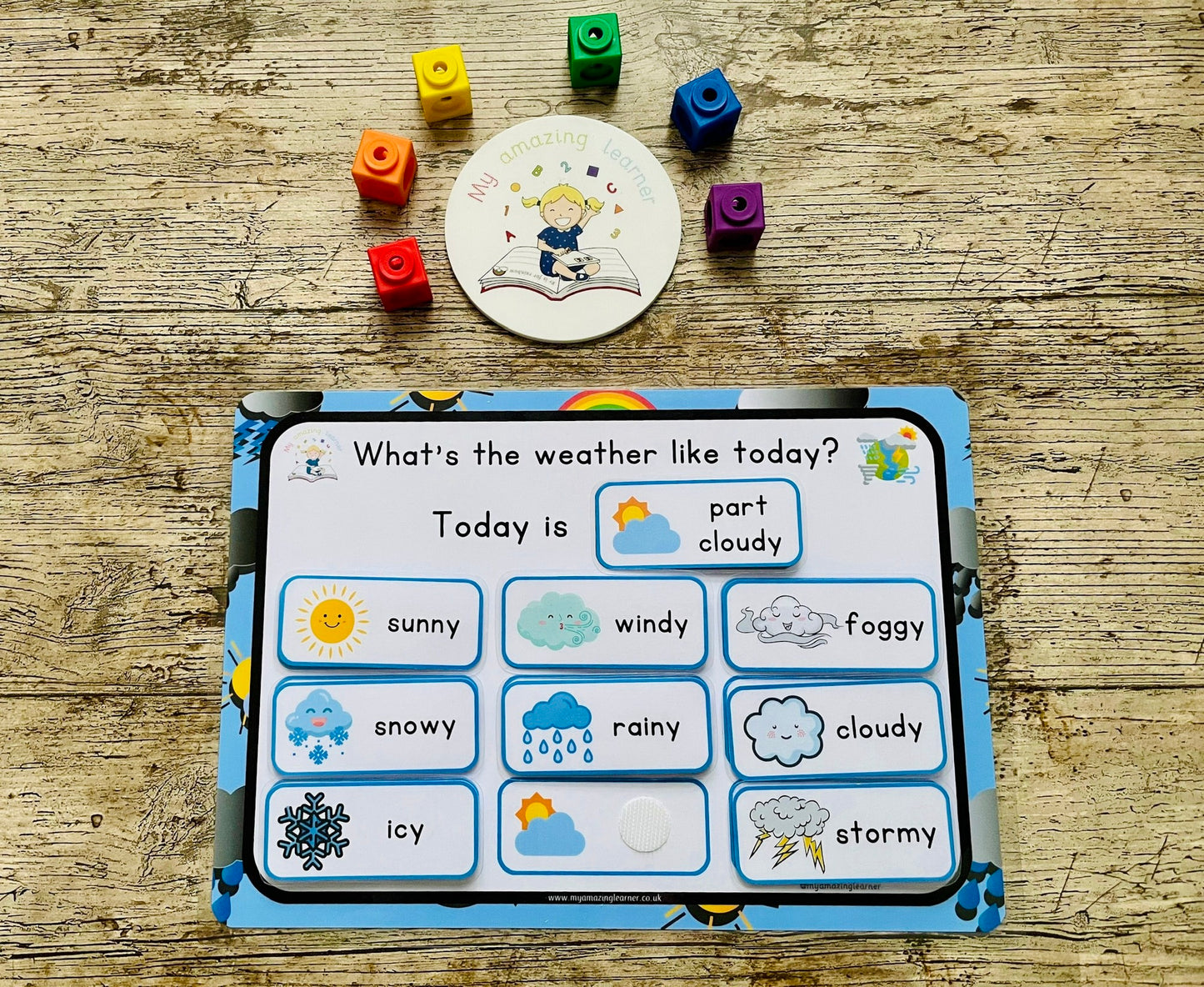 Develop your 'Amazing Learner's' understanding of their surroundings with our Weather velcro mat. This top-rated product educates on the various types of weather and allows for hands-on practice in matching and sorting, connecting it to everyday life.